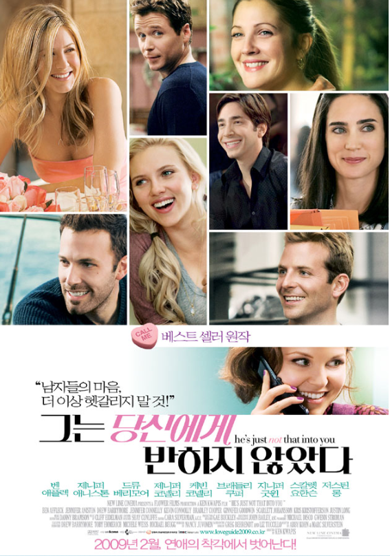 영화 <그는 당신에게 반하지 않았다>는 영화 <러브 액츄얼리>를 연상하게 되는 미국의 전형적인 로맨틱 코미디 영화입니다. 감독은 켄 콰피스 가 맡았으며, 원작은 소설입니다. 옴니버스 형식으로 이루어진 영화이기 때문에 여러 명의 남녀 주인공이 등장합니다. 그런데 캐스팅이 정말 어마어마합니다. 벤 애플렉, 제니퍼 애니스턴, 드류 베리모어, 제니퍼 코넬리, 케빈 코넬리, 브래들리 쿠퍼, 지니퍼 굿원, 스칼렛 요한슨, 저스틴 롱까지... 아마 2009년이었기에 이 캐스팅이 가능했었지 않았나 싶습니다. 지금 같으면 몸값이 너무 비싼 배우들이기 때문에 한 영화에 이렇게 많은 인기 배우들을 쓰기 어렵지 않을까 싶습니다. 그럼 지금부터 영화 <그는 당신에게 반하지 않았다>의 줄거리를 소개하겠습니다. 등장인물이 많기 때문에 주로 인물 간의 관계를 위주로 설명해드리겠습니다.